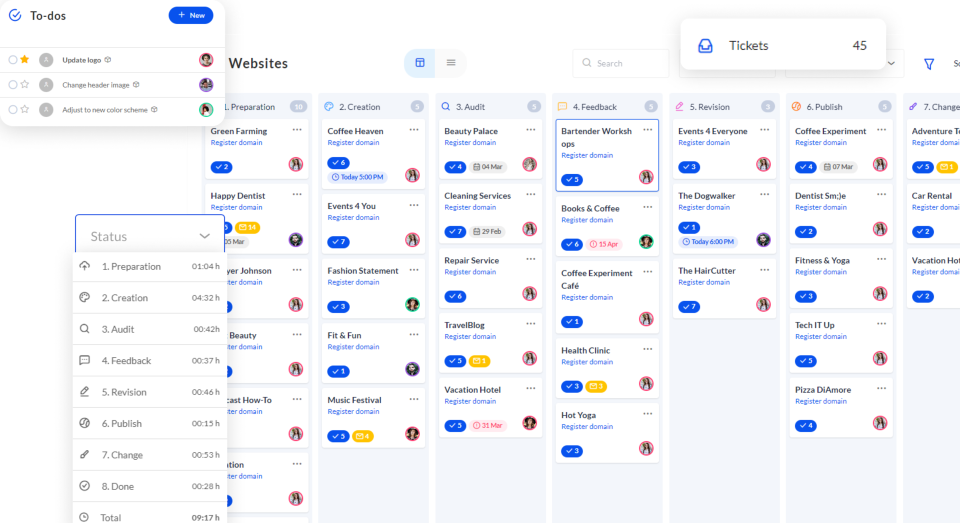 Manage your projects and clients hassle-free with time tracking, status and to do management, ticket system, simplified customer CMS, and more.