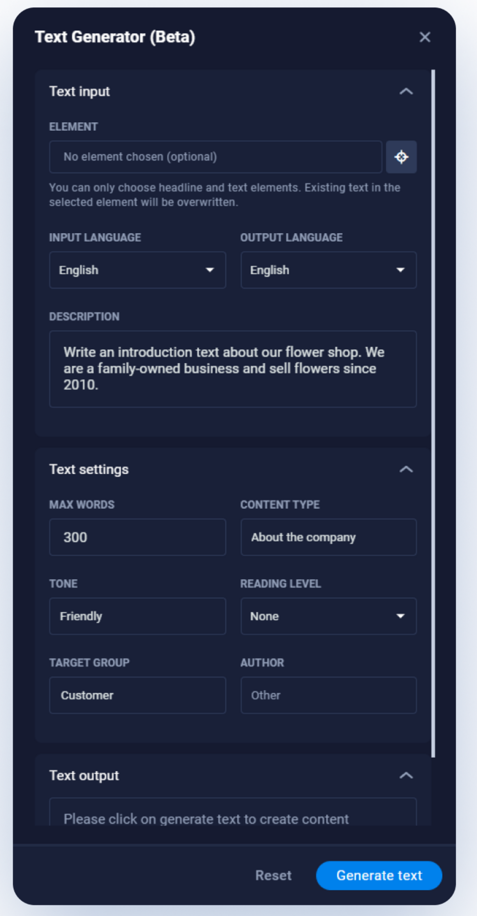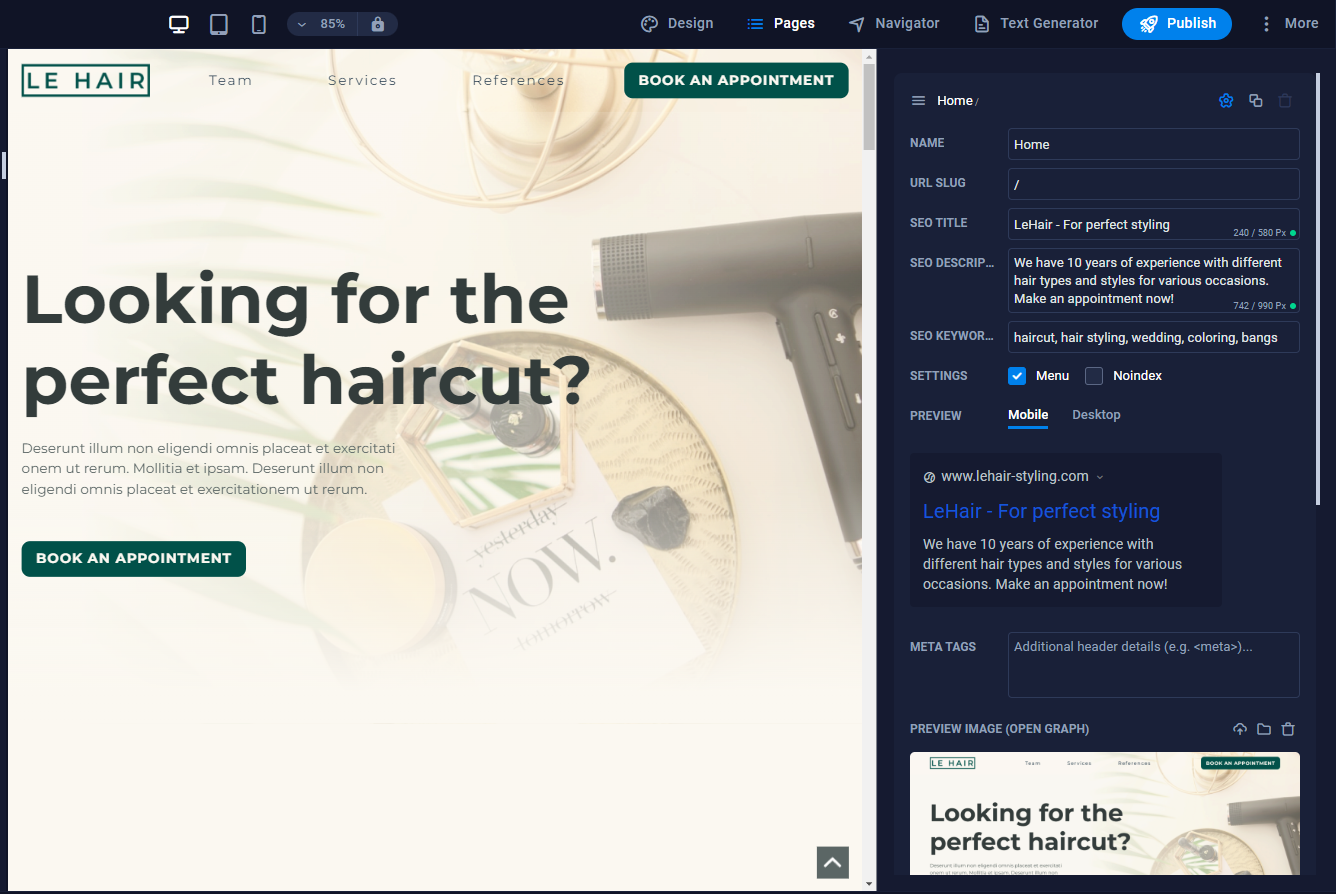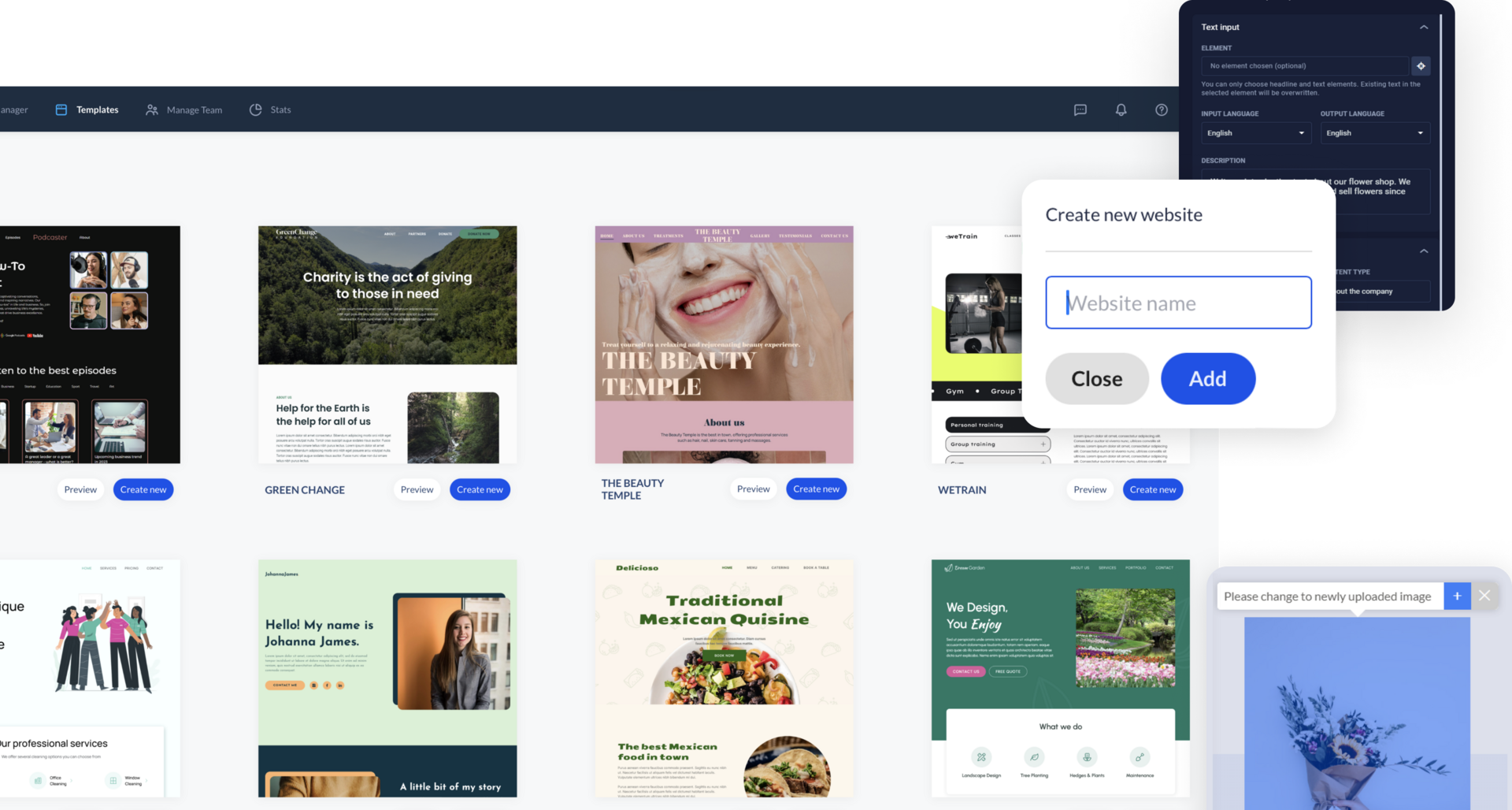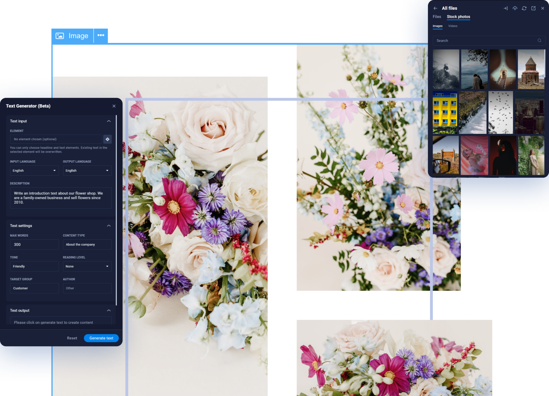 Captivate your website visitors with engaging content and appealing visuals thanks to the integrated AI text generator and free stock photos.