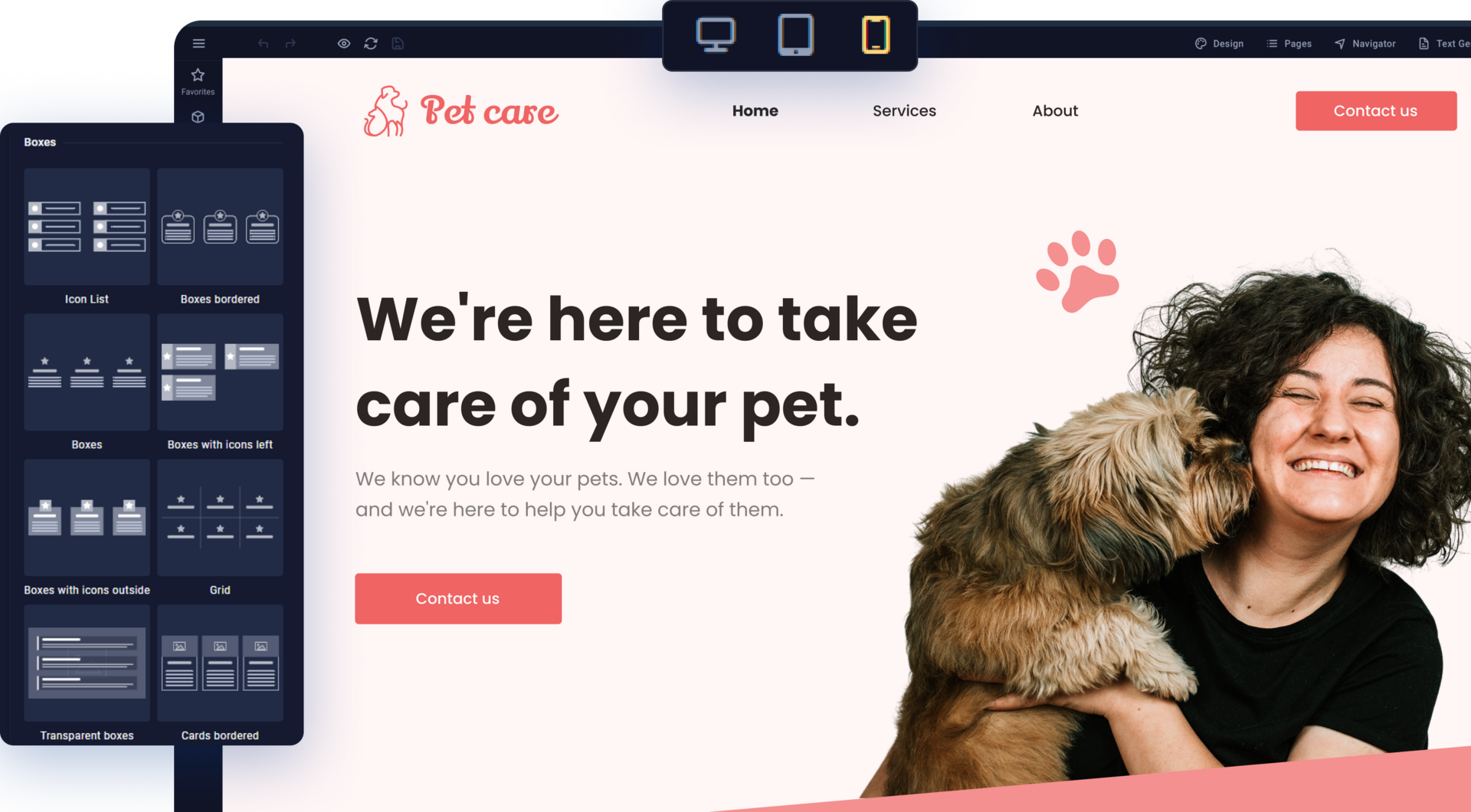 Effortlessly build stunning websites, without a single line of code. Pick a template, add and customize elements through an easy-to-use visual editor. It's as simple as that.